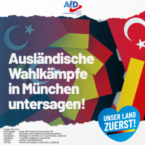 Dass ausländische Wahlkämpfe in Deutschland ausgetragen werden, ist schon an sich ein kurioses Symptom einer völlig verfehlten Migrations- und Integrationspolitik. Von Integration kann offensichtlich keine Rede sein, wenn ein für die Präsidentschaftswahlen in der Türkei maßgeblicher türkischer Volksanteil in Deutschland lebt und hier zur Wahl gehen kann. Die Stadt Nürnberg hat nun ausländische Wahlwerbung konsequenterweise untersagt, um zweifelhaften Parteien in der Türkei nicht auch noch eine Bühne zu bieten. Das finden wir richtig und fordern auch für München eine Begrenzung ausländischer Wahlkämpfe.