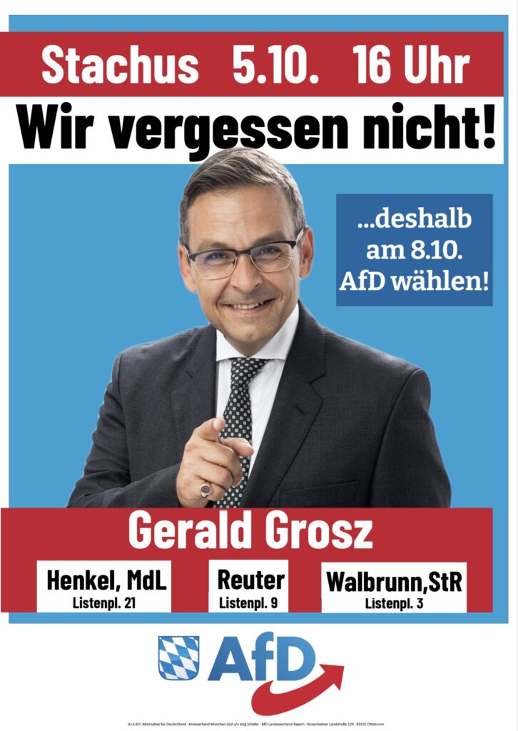 Einen besonderen Gastredner konnten die Münchner Kreisverbände Nord, Süd und West/Mitte für ihre Wahlkampfabschlusskundgebung am Stachus gewinnen: der aus den Medien bekannte Publizist und ehemalige österreichische Bundespräsidentenkandidaten Gerald Grosz wird […]