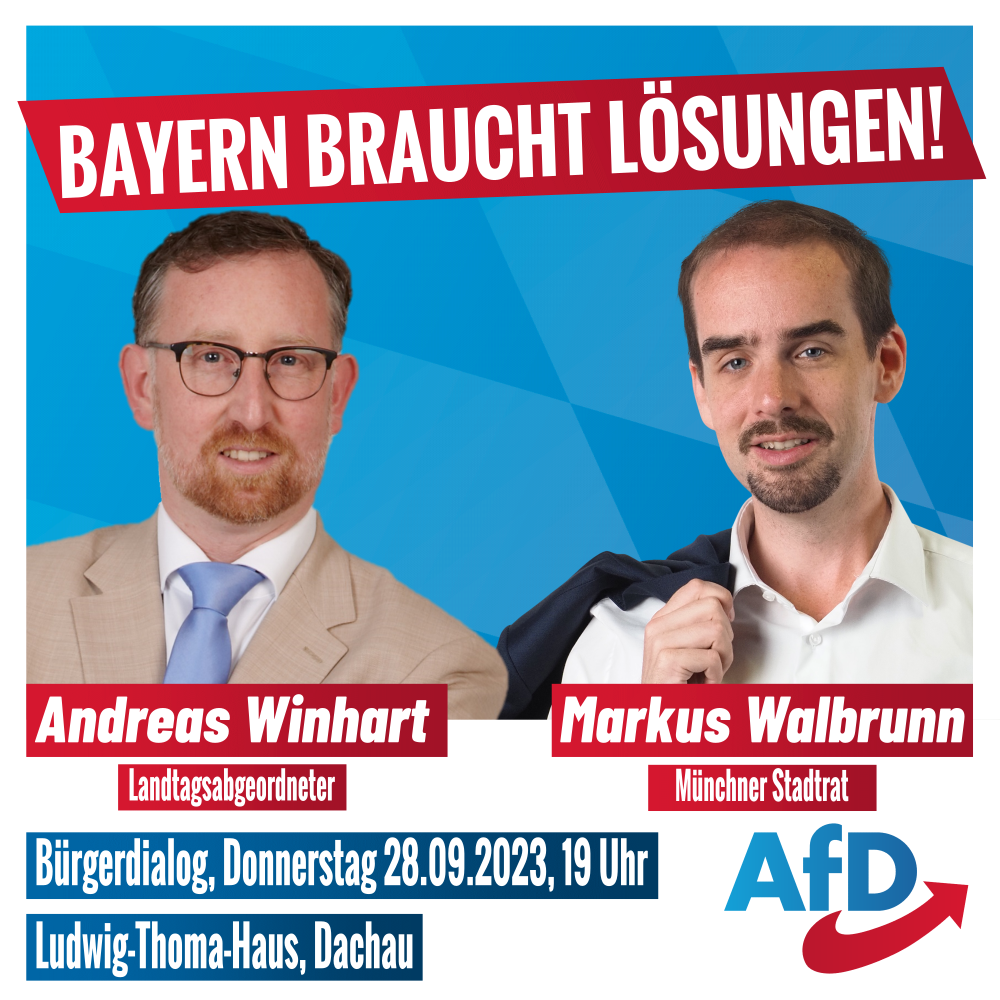 Am Donnerstag, den 28. September findet im Ludwig-Thoma-Haus (Augsburger Str. 23, 85221 Dachau) ein Bürgerdialog mit dem oberbayerischen Listenführer Andreas Winhart sowie dem Direktkandidaten des Stimmkreises 106 München-Pasing und Münchner […]