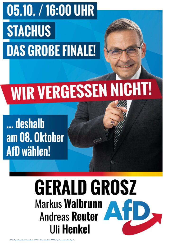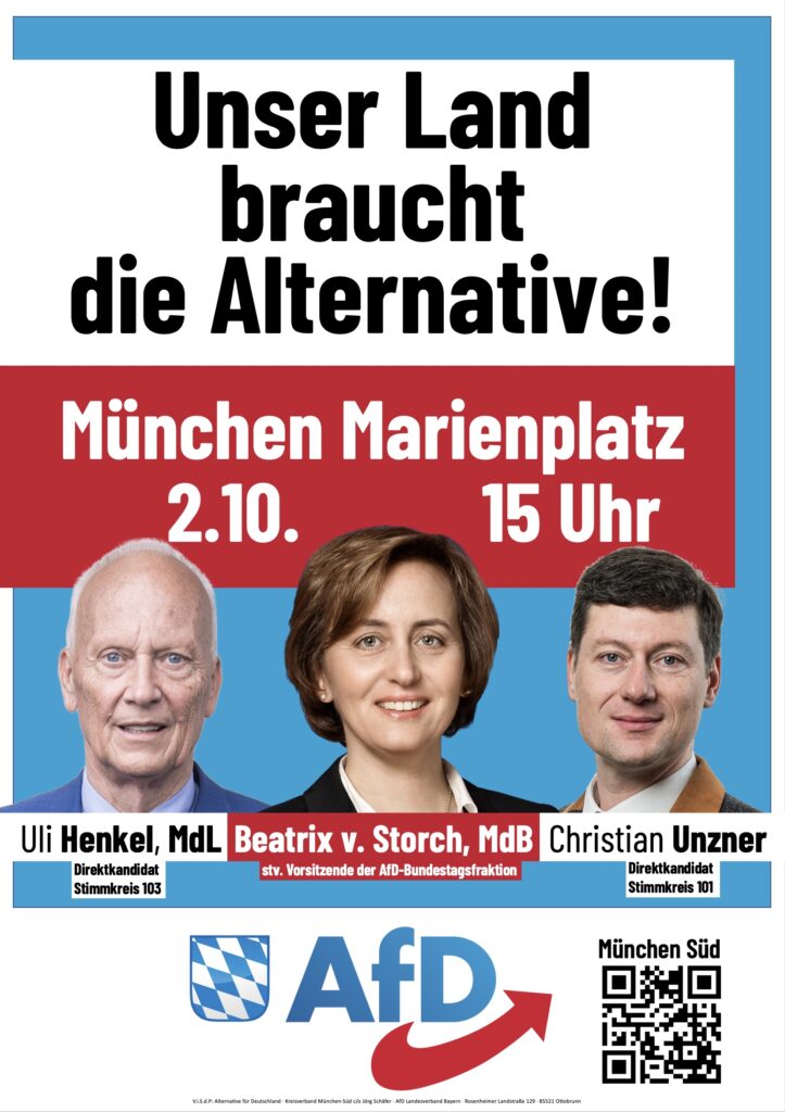 Am 05. Oktober veranstalten die Münchner Kreisverbände Nord, Süd und West/Mitte, ihre Wahlkampfabschlusskundgebung am Stachus! Die Kundgebung beginnt um 16 Uhr. Als Hauptredner konnte der Starpublizist und ehemalige österreichische Bundespräsidentenkandidaten […]