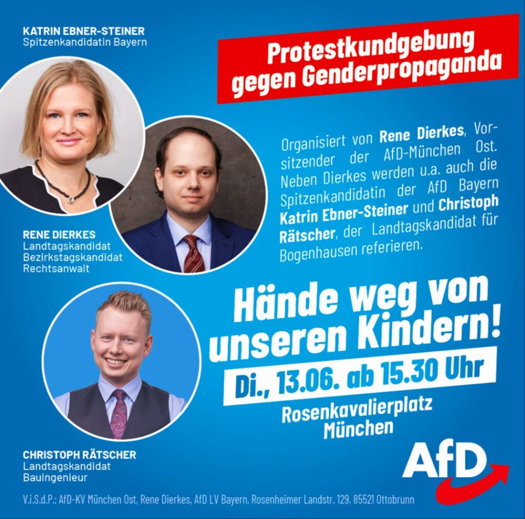 Rene Dierkes, Landtagskandidat und Vorsitzender des AfD-KV München Ost, sowie Organisator der Kundgebung: „Die Süddeutsche Zeitung berichtete, dass die AfD zuletzt die öffentliche Debatte über die Drag-Lesung für Kleinkinder in […]