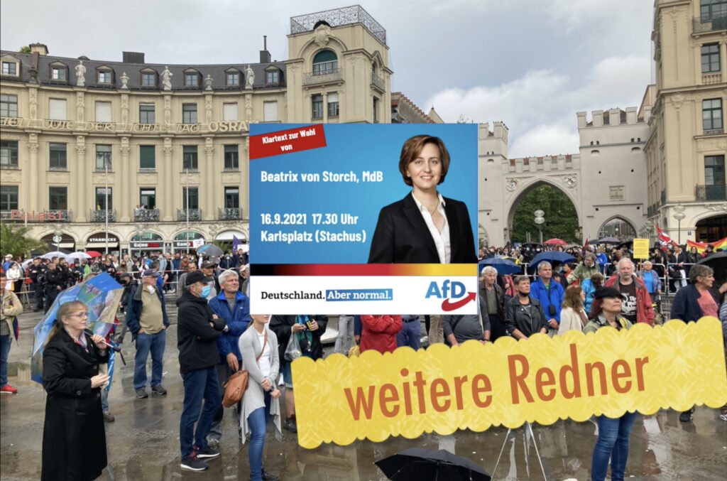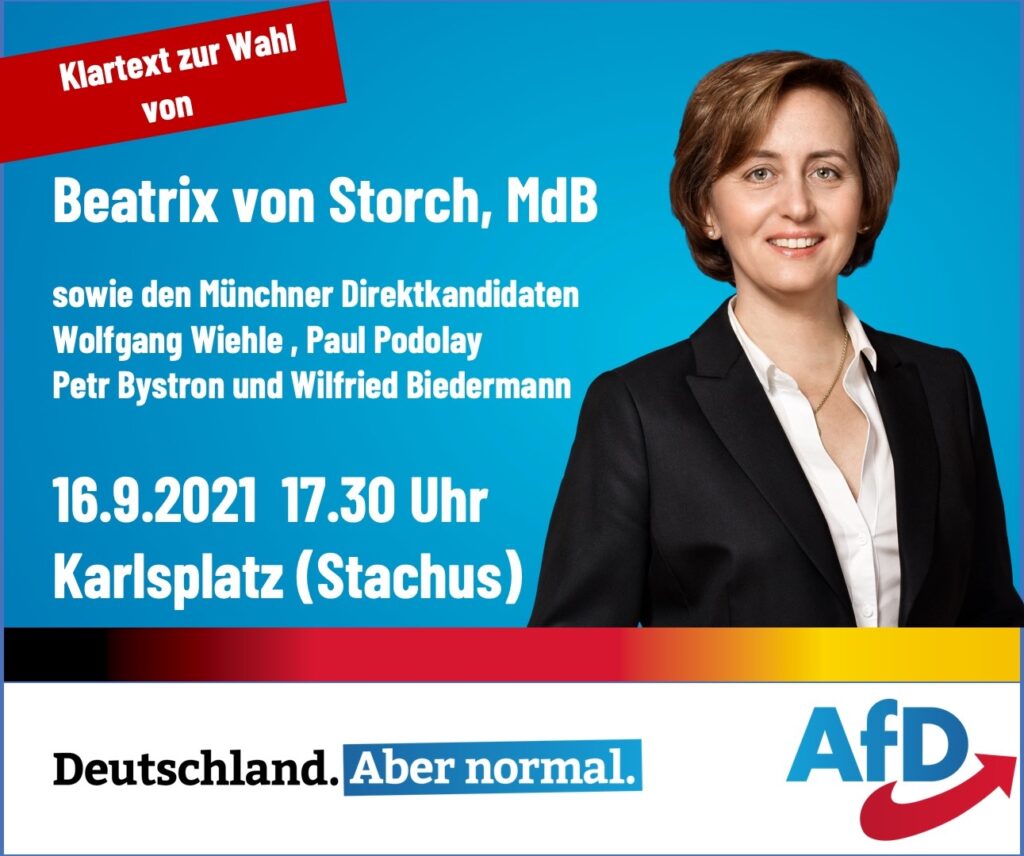 Neben der Hauptrednerin Beatrix von Storch sprachen am Stachus weitere Bundestagsabgeordnete, die wieder für das deutsche Parlament kandidieren: Gerold Otten (Direktkandidat München-Land), Wolfgang Wiehle (Direktkandidat München-Süd) und der bayrische Spitzenkandidat […]