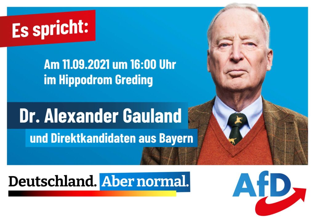 Samstag, 11.09.2021, 16 Uhr (Einlass: 15 Uhr), Hippodrom, Industriestr. 18, Greding: Auf Einladung der Bezirksverbände Oberbayern und Mittelfranken kommt der AfD-Ehrenvorsitzende Dr. Alexander Gauland, Vorsitzender der AfD-Bundestagsfraktion, in die bekannte […]