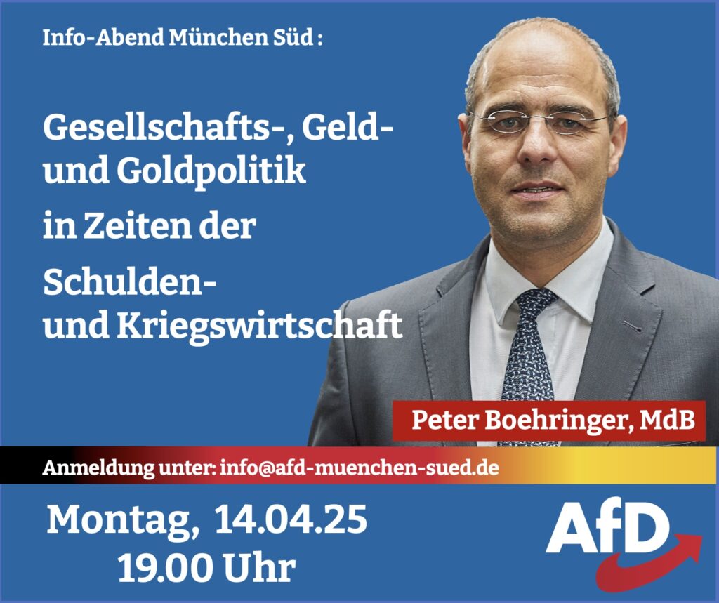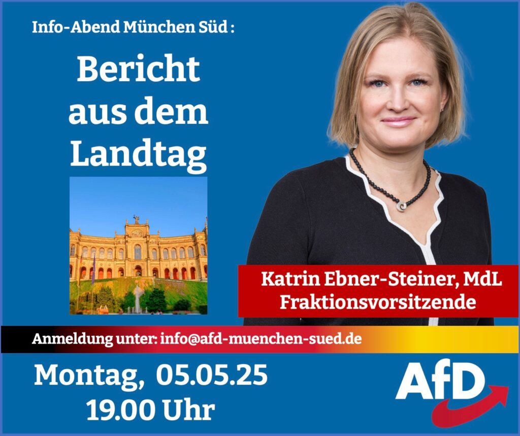 Wir laden Sie herzlichst ein zu unserem nächsten Infoabend am 7. Mai (Beginn 19 Uhr/Einlass 18:45 Uhr) im AfD-Bürgerbüro München Ost in der Sebastian-Bauer-Str. 8, 81737 München. 📺 Die Landtagsabgeordneten Benjamin […]