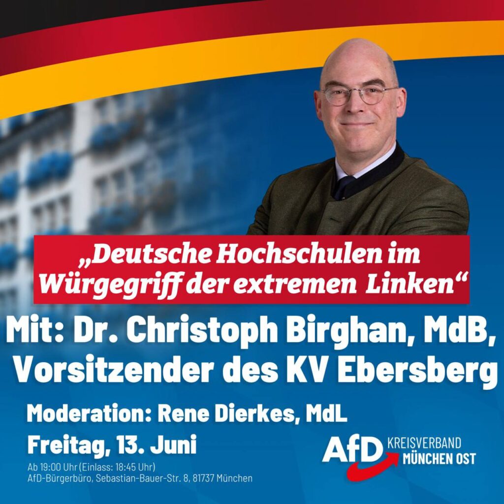 Wir laden Sie herzlichst ein zu unserem nächsten Infoabend am 13. Juni (Beginn 19 Uhr/Einlass 18:45 Uhr) im AfD-Bürgerbüro München Ost in der Sebastian-Bauer-Str. 8, 81737 München. 🏫 Der Bundestagsabgeordnete […]