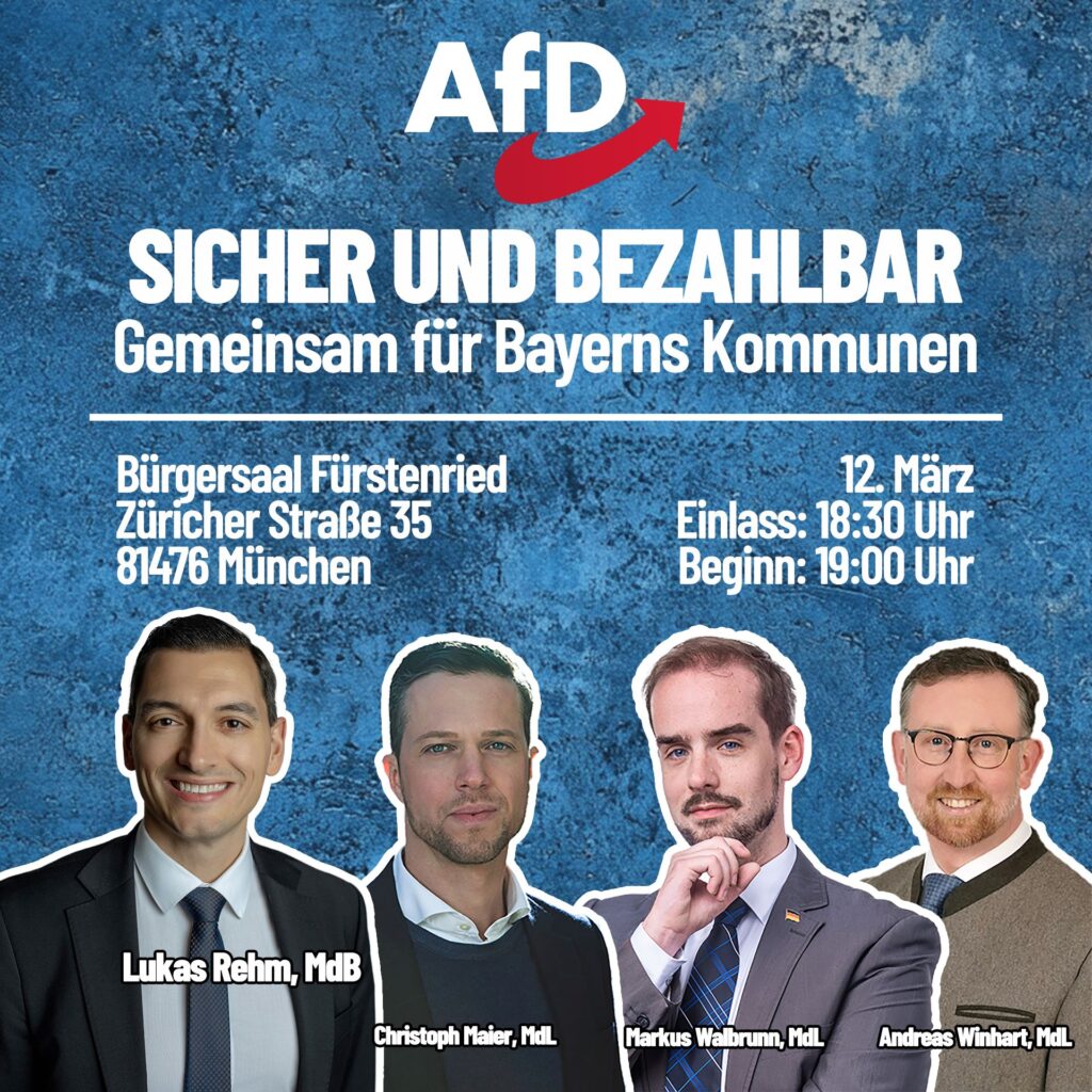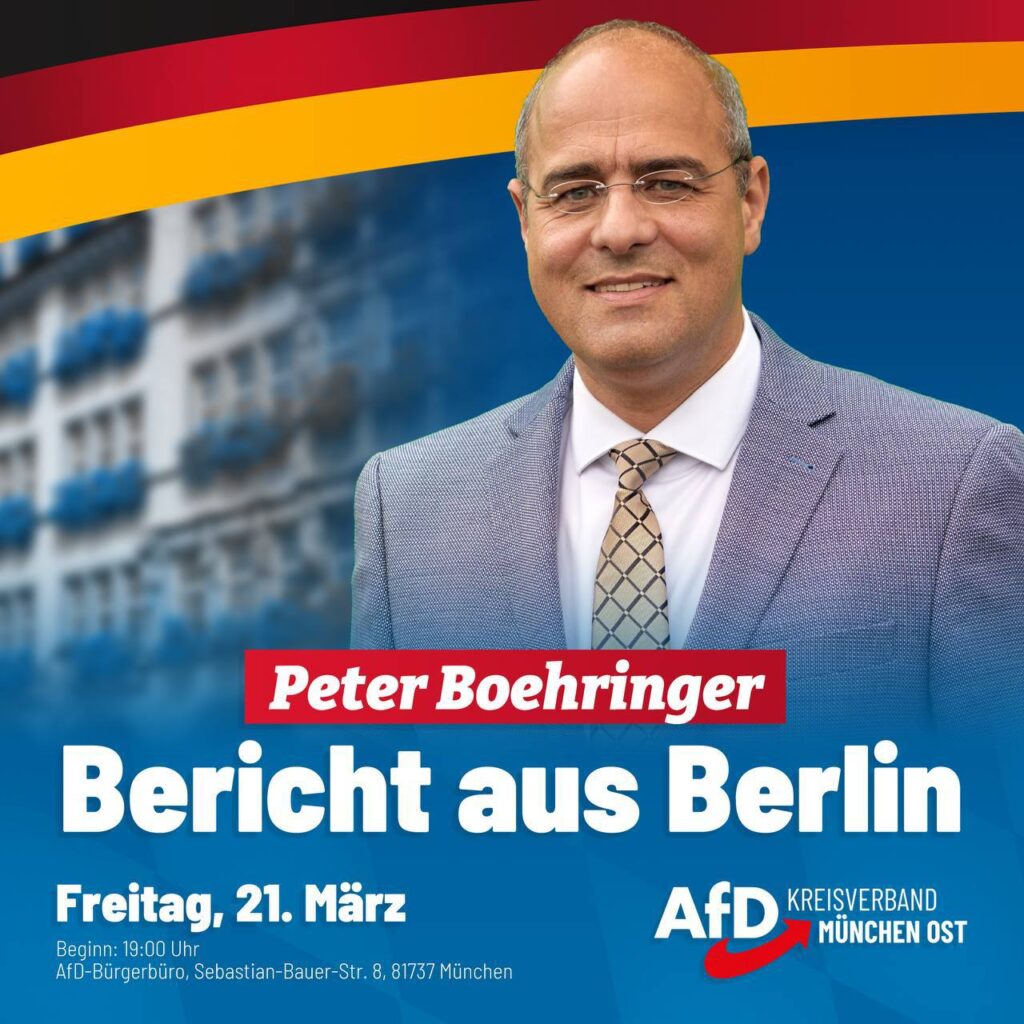 Wir laden Sie herzlichst ein zu unserem nächsten Infoabend am 21. März (Beginn 19 Uhr/Einlass 18:45 Uhr) im AfD-Bürgerbüro München Ost in der Sebastian-Bauer-Str. 8, 81737 München. Peter Boehringer, Bundestagsabgeordneter, […]