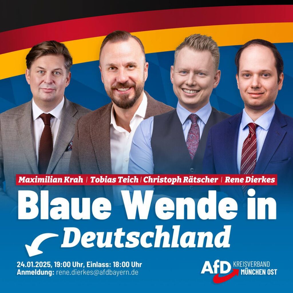 Maximilian Krah kommt nach München! Wir laden Sie herzlichst ein zu unserer Wahlkampfveranstaltung „Blaue Wende“ am 24.01. (Beginn 19 Uhr/Einlass 18 Uhr) im Münchner Osten. Mit: Dr. Maximilian Krah aus […]