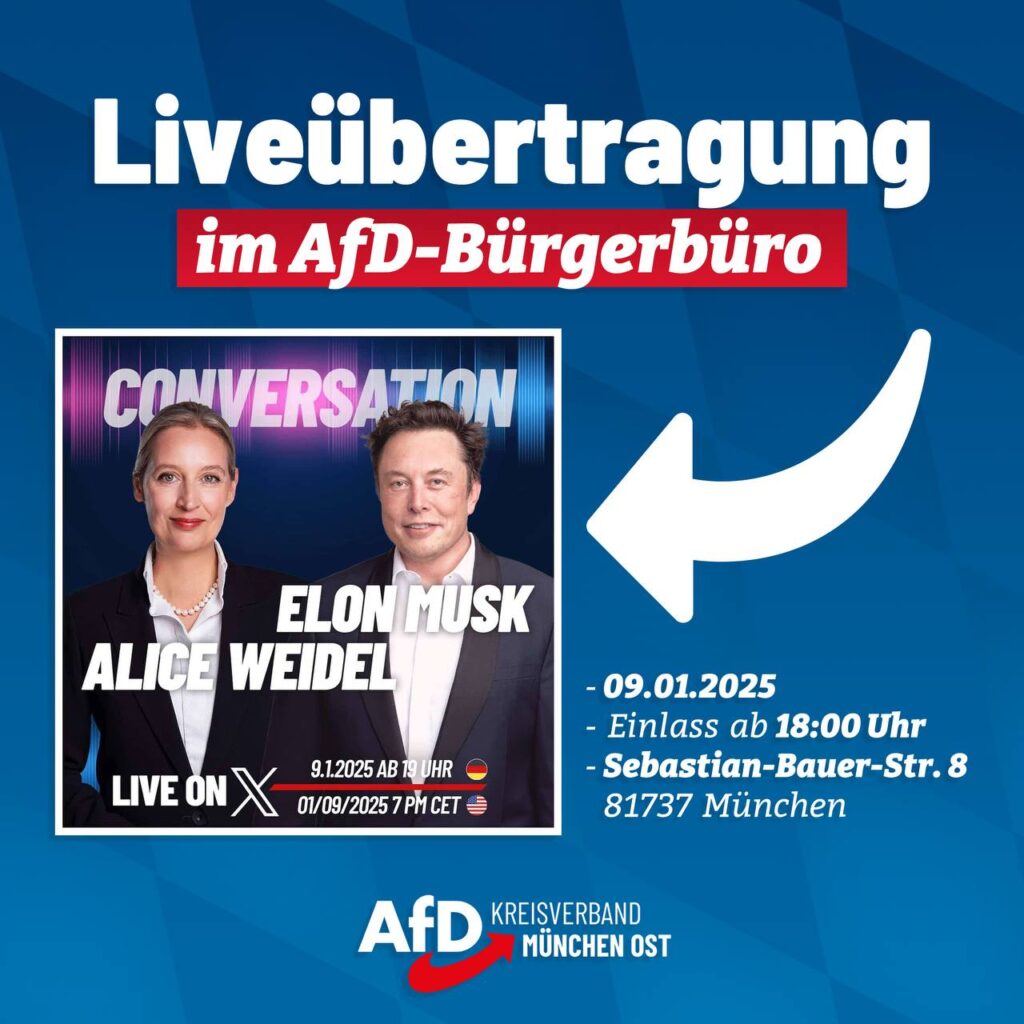 Mehr lesenLiveübertragung des Gesprächs Weidel/Musk am 9. Januar im Bürgerbüro