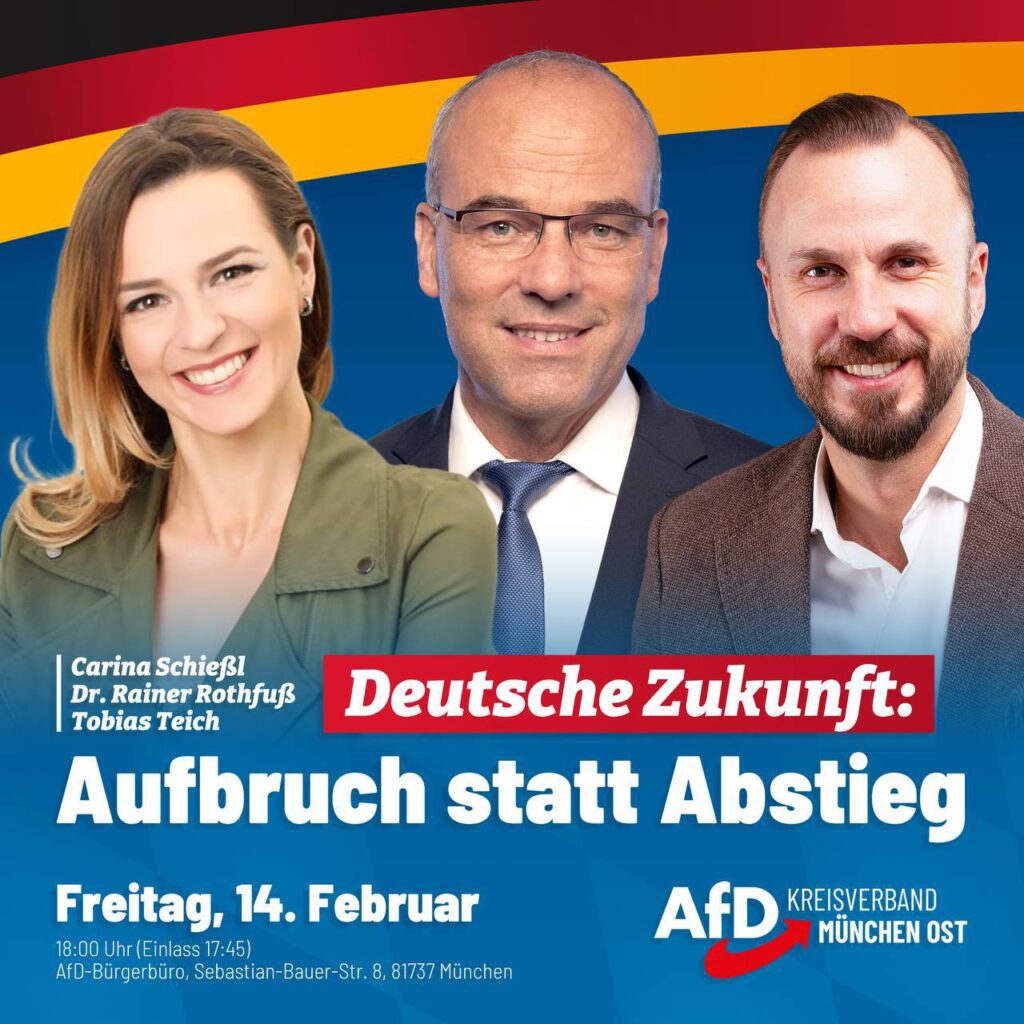 Wir laden Sie herzlichst ein zu unserer Wahlkampfveranstaltung „Aufbruch statt Abstieg“ am 14.02. (Beginn 18 Uhr/Einlass 17:45 Uhr) im AfD-Bürgerbüro München Ost in der Sebastian-Bauer-Str. 8, 81737 München. Mit dem […]