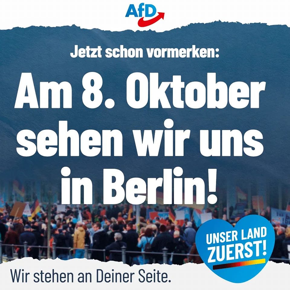 Mehr lesenBundesweite Kundgebung der AfD in Berlin am 8.10.2022 ab 13.30 Uhr am Platz der Republik #UnserLandZuerst
