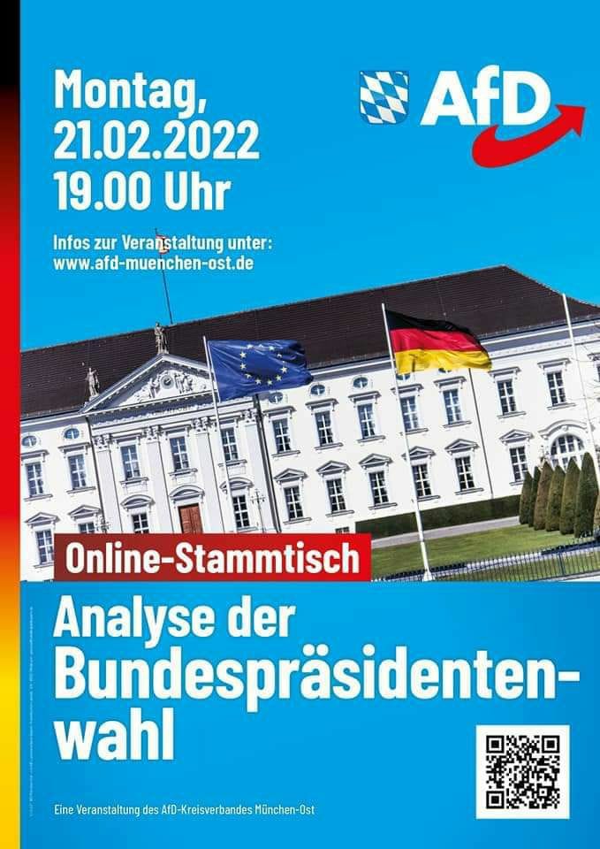 Der AfD Kreisverband München Ost lädt Sie zum kommenden Zoom-Stammtisch ein. Thema: Analyse der Wahl des Bundespräsidenten Redner: Petr Bystron, MdB Moderation: Rene Dierkes Zeit: 21. Februar 2022 um 19 […]