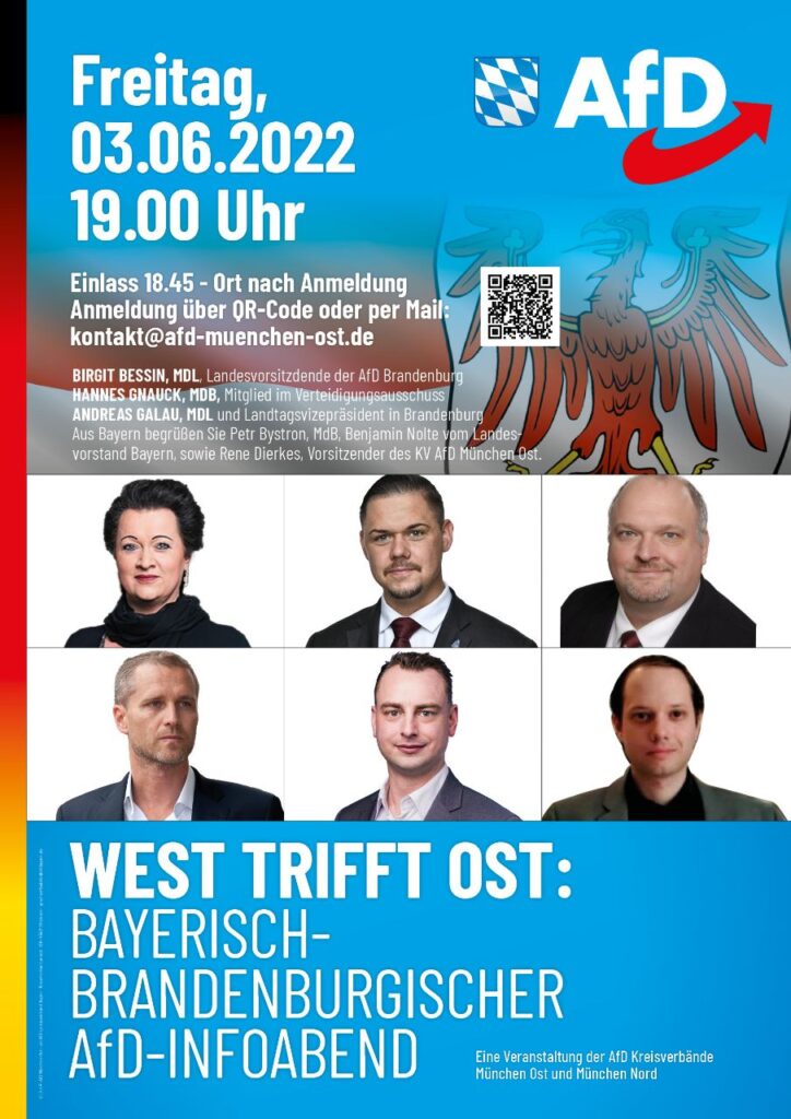 Werte Mitglieder und Interessenten der AfD, die AfD Kreisverbände München Ost und München Nord laden zum bayerisch-brandenburgischen Info-Abend ein. Seien Sie dabei, wenn Abgeordnete und Landesvorstände aus West und Ost […]