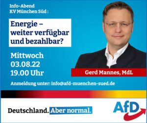 Viele Bürger merken jetzt, welche Rolle die Energieversorgung in unserem Land aber auch für ihren Geldbeutel spielt. Noch nicht allen ist klar, wo die Ursachen für die derzeitige Lage zu suchen sind. Die Medien versuchen diese alleine auf den Ukraine-Krieg und die Sanktionen zu fokussieren. Umfassende Antworten zum Thema Energieversorgung erhalten Sie beim kommenden Infoabend des KV München Süd von Gerd Mannes, MdL und stellvertretender Landesvorsitzender in Bayern. Wir freuen uns wie immer auf eine rege Teilnahme und Diskussion.