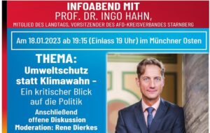 Prof. Dr. Ingo Hahn, Mitglied des bayerischen Landtags wird zum Thema „Umweltschutz statt Klimawahn“ referieren und aktuelle Entwicklungen zu dem Thema aufzeigen.