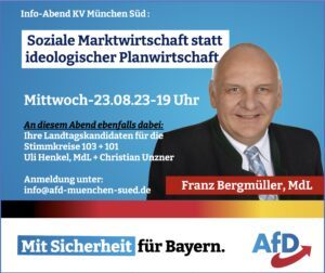 Franz Bergmüller, MdL, informiert an diesem Abend über die aktuelle Situation der ehemals erfolgreichen sozialen Marktwirtschaft in diesem Land und warnt vor den Auswirkungen der sich derzeit manifestierenden Bedrohung dieses Erfolgsmodells.