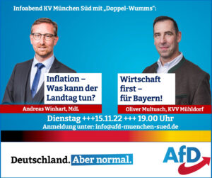 Herzlich willkommen beim Infoabend der AfD München Süd! Zwei kompetente Gastreferenten sprechen über zwei topaktuelle Themen: Andreas Winhart MdL und KV Vorsitzender Rosenheim und Oliver Multusch, Stadtrat und KV Vorsitzender Mühldorf beleuchten unter zwei Aspekten den Themenbereich „Inflation und Wirtschaft in Bayern“. Im Anschluß heißt es dann wie gewohnt Fragen und Diskussion erwünscht!