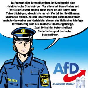 Durch eine weitgehend unkontrollierte Zuwanderungs- und Asylpolitik haben wir uns ein besorgniserregendes Gewalt- und Gefährdungspotential nach München geholt. Die AfD-Stadtratsgruppe und ihre Vertreter werden dies auch in Zukunft weiter beleuchten und anprangern. Wir müssen jetzt unsere grenzenlose Weltoffenheit überdenken, Sprachverbote kippen und offen über die Gefahren der Massenmigration sprechen.