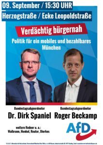 Am Samstag den 09. September veranstaltet die Münchner AfD, von 15:30 Uhr bis 17:30 Uhr, am Rande des Corso Leopold in der Herzogstraße, Ecke Leopoldstraße (https://goo.gl/maps/TqaHb2nnC4QRhL7d7) eine Kundgebung mit prominenten Gästen.