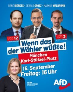 Als weitere Redner haben sich die bayerische Spitzenkandidatin Kathrin Ebner-Steiner sowie die Münchner Landtagskandidaten Markus Walbrunn und Rene Dierkes angekündigt!
