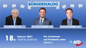 Drei Bundestagsabgeordnete der AfD stehen am 18. Februar für Ihre Fragen bereit. Klicken Sie sich in den Bürgerdialog, der von 18 bis 20 Uhr als livestream auf der Facebookseite der AfD München stattfindet. Herzlich willkommen!