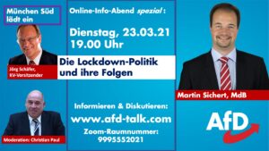 Der Lockdown scheint nicht enden zu wollen. Abgesehen davon, dass er für die Pandemie-Bekämpfung ganz offensichtlich nichts bringt, verursacht er Schäden in allen Lebensbereichen. Der Nürnberger Bundestagsabgeordnete Martin Sichert zeigt auf, welche sozialen Folgen die Coronamaßnahemn der Bundesregierung haben und noch hervorrufen werden. Nach dem Vortrag freuen wir uns auf eine wie immer lebendige und konstruktive Diskussion.