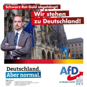 Egal wann und wo, ob in Krieg oder in Frieden, unsere Farben sind Schwarz-Rot-Gold und Weiß-Blau. Die AfD-Stadtratsgruppe München steht zu unserem deutschen Vaterland und unserer bayerischen Heimat!