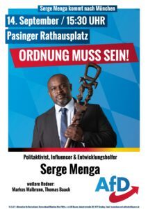 Der Kreisverband lädt Sie herzlich zu einer Doppelveranstaltung mit dem Politaktivisten und Influencer Serge Menga ein. Dabei handelt es sich um eine Kundgebung und einen Infoabend, jeweils unter dem Motto „Ordnung muss sein!“.