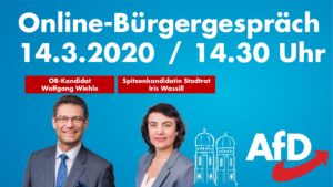Diskutieren Sie am 14.3. mit unseren Spitzenkandidaten. Bei unserem Bürgergespräch stehen Ihnen unser OB-Kandidat Wolfgang Wiehle und unsere Spitzenkandidatin für den Stadtrat, Iris Wassill, im Live-Chat Rede und Antwort. Für die Teilnahme ist eine Anmeldung über ein Google-Konto erforderlich.